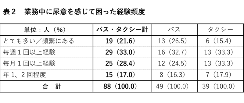 バスドライバーでは、困ったことがある人は77.8%、そのうち漏らしたことがある人は15.9%でした。タクシードライバーでは、困ったことがある人は72.2%、そのうち漏らしたことがある人は11.1%でした。バスドライバーが、困ったことがある人、漏らしたことがある人ともに高い比率です。