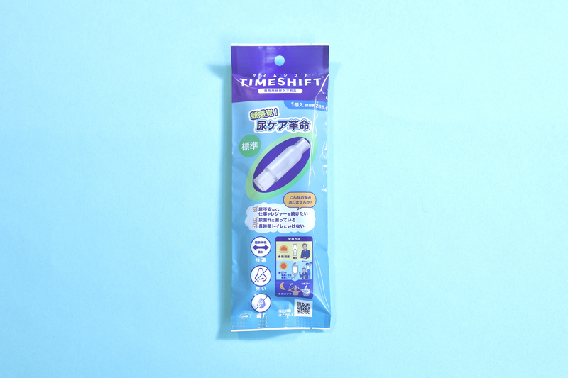 「タイムシフト」は、オムツやパッドとは異なり、尿をまず製品本体内に保持し、その後で男性用トイレで普通に排出できる尿ケア製品です。業務中で我慢できない時も安心して過ごせます。